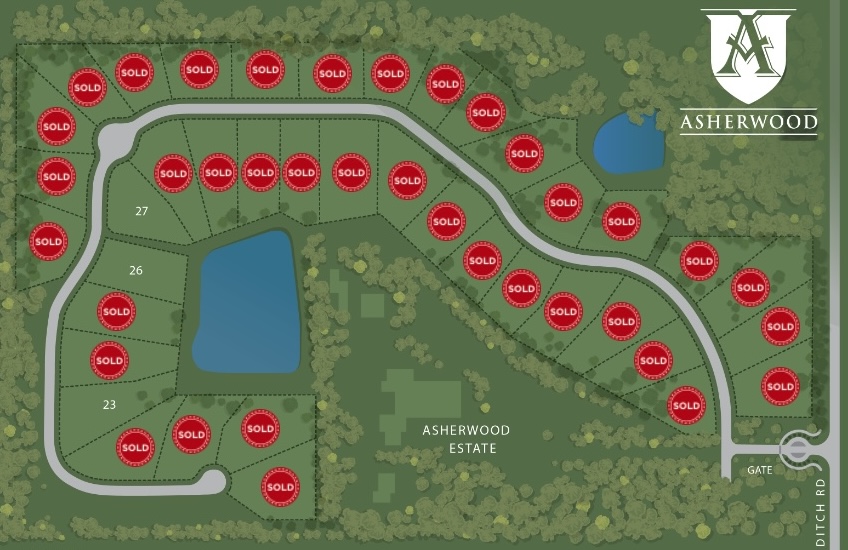 This property will be inclusive of 40 private 1-acre lots. The Asherwood Estate will remain as a private residence. This gated community, encircled by mature trees, will be one of the last premier sites on the west side of Carmel.